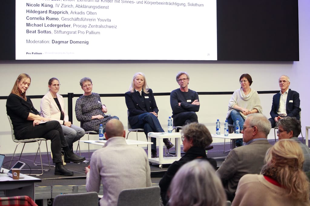 Dagmar Domenig, Vizepräsidentin von Pro Pallium, leitet die die zweite Gesprächsrunde. Letizia von Laer (ZKSK Solothurn), Nicole Küng (IV Zürich), Hildegard Rapprich (Arkadis Olten), Cornelia Rumo (Youvita), Michael Ledergerber (Procap Zentralschweiz) und Beat Sottas gleichen den Handlungsbedarf aus Sicht unterschiedlicher Akteure ab und loten aus, welche Ansätze den Familien mehr Lebensqualität und Versorgungsgerechtigkeit sichern. Die Teilnehmenden sind sich einig, dass grosser Reformbedarf besteht. Letizia von Laer ortet ein Kernproblem darin, dass Fachpersonen gar nicht lernen, die Eltern als Experten einzubeziehen. Cornelia Rumo, Youvita-Geschäftsführerin, verweist auf die negativen Folgen der Angebots- und Leistungsauftragslogik. Es gehe aber nicht darum: «was bieten wir an, holt es euch. Sondern: Was ist der Bedarf der einzelnen Familien und wie können wir das flexibel und situationsgerecht adaptieren?»